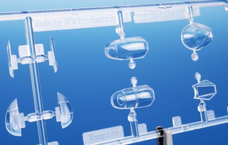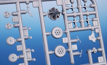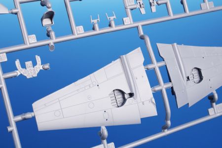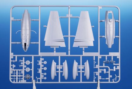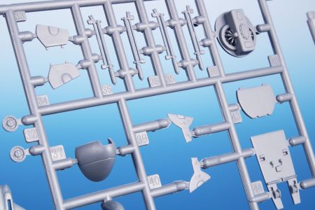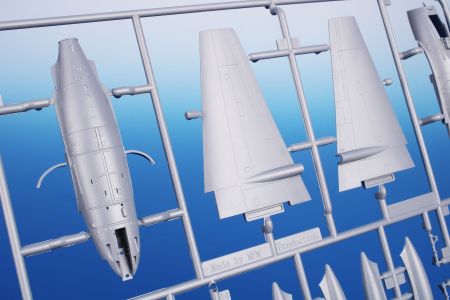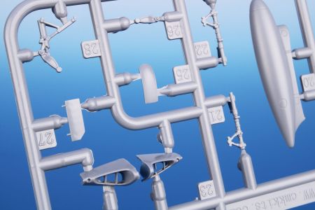 Obsah stavebnice: tři rámečky výlisků doplňují rámeček čirých dílů, obtisky a PUR díly výzbroje a výstroje.