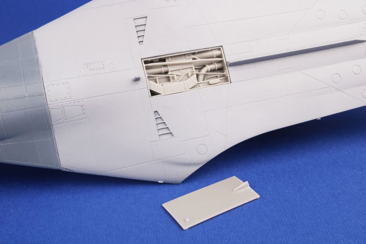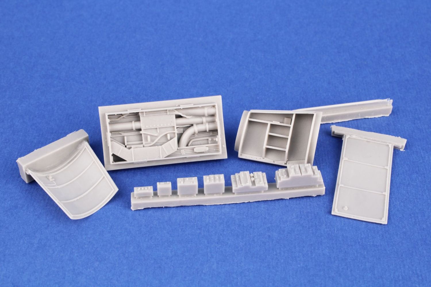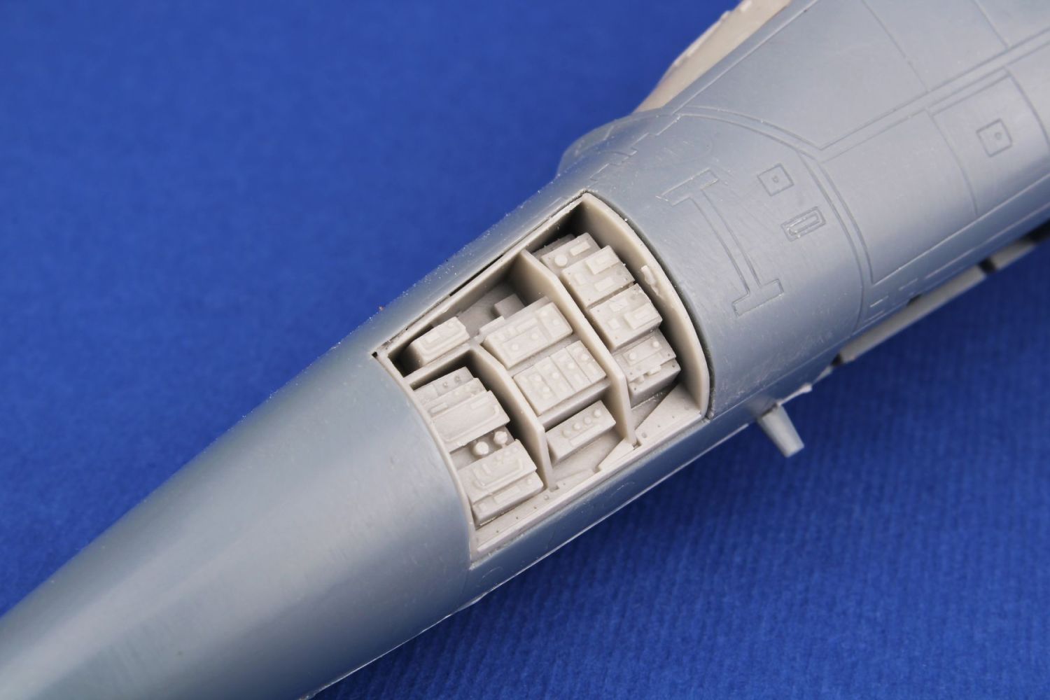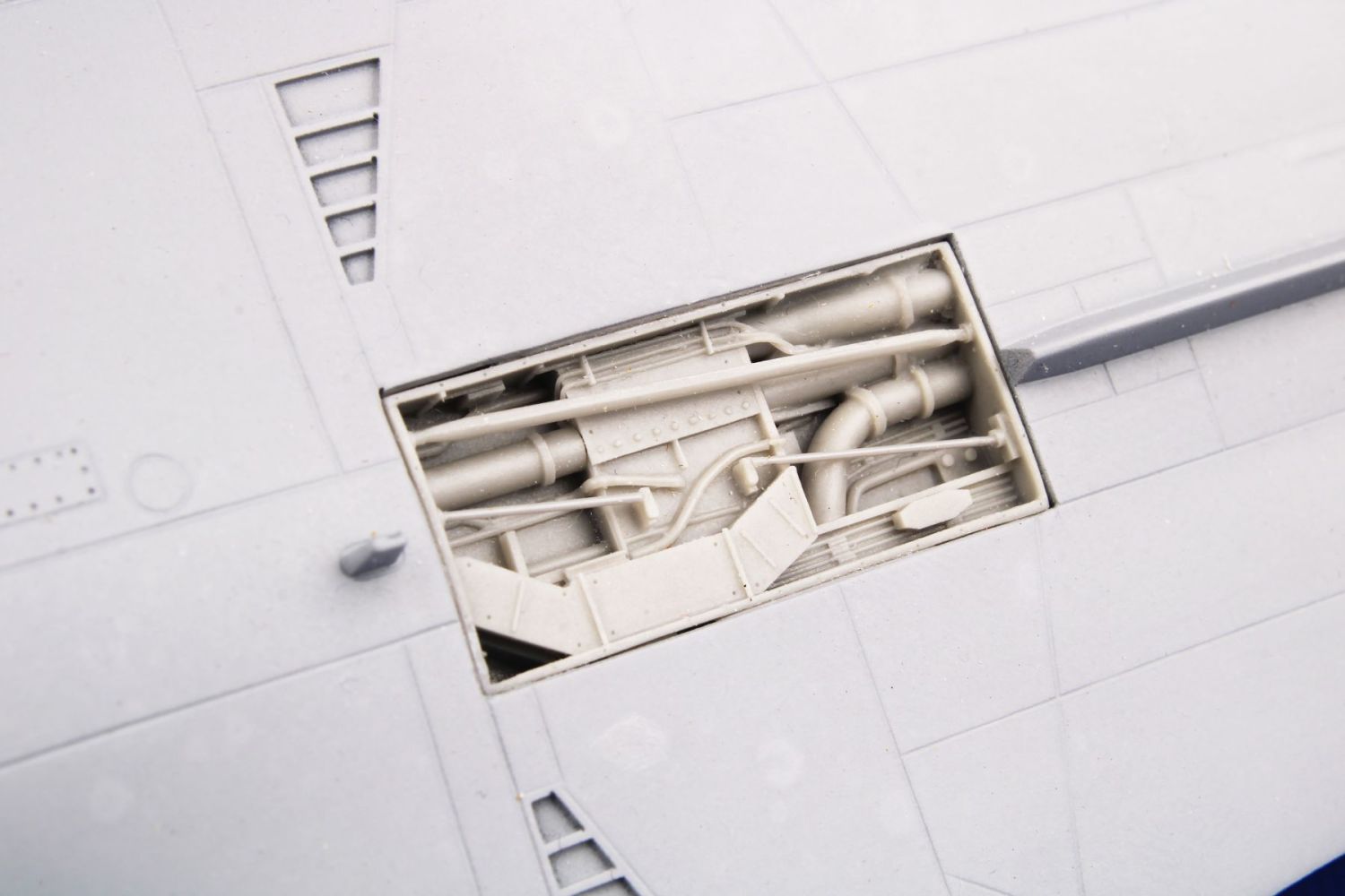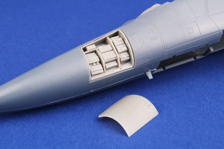 Detailní odlitky otevřených boxů elektroniky na levé straně přídě a hřbetu trupu určené pro F-111E firmy Italeri.