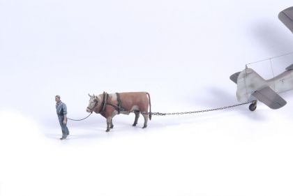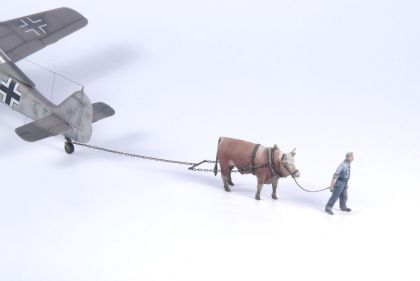 Na konci druhé světové války byly situace Třetí říše v zásobování pohonnými hmotami tristní. V rámci úspor paliva byla k přesunu letadel na letištních plochách používány tažná zvířata. To se týkalo i nejmodernějších proudových a raketových letadel jako byly Me 262 nebo Me 163. V roce 1945 bylo tedy možné spatřit situaci, kdy raketový letoun Me 163, který byl v té době patrně nejrychlejším bojovým letounem světa, táhne obyčejný vůl. Sada nabízí mechanika Luftwaffe s tažným zvířetem, s jehož pomocí byl po letišti přepravován letoun Me-163B Komet. (Figurky vznikly podle dobové fotografie. Rovněž existuje fotografie, kde je stejným způsobem tažen letoun Bf 109G). Zvíře je ale možné využít i do jakéhokoliv jiného diorámatu, kde je možné jej uplatnit.